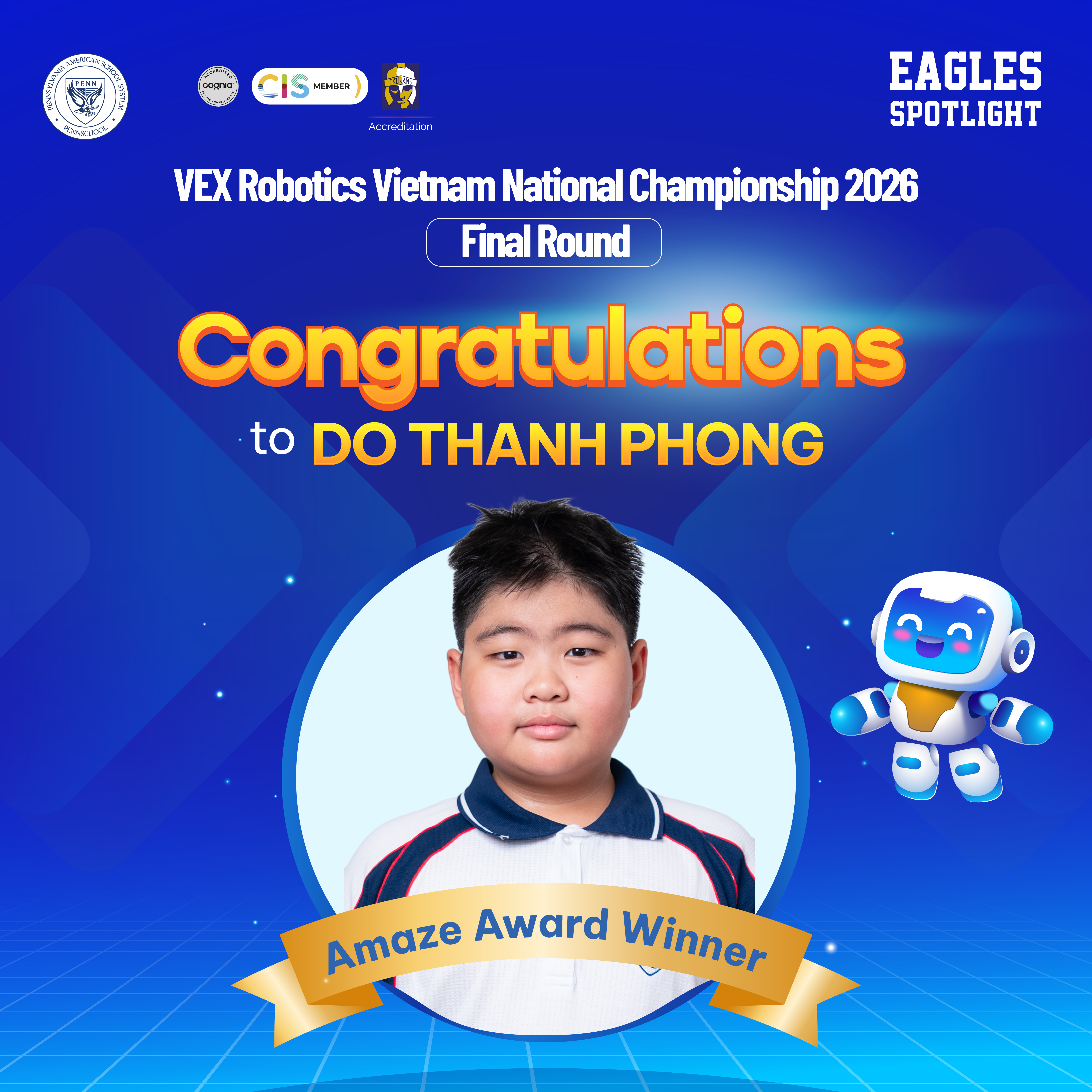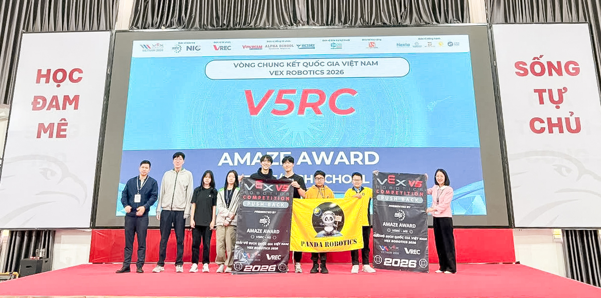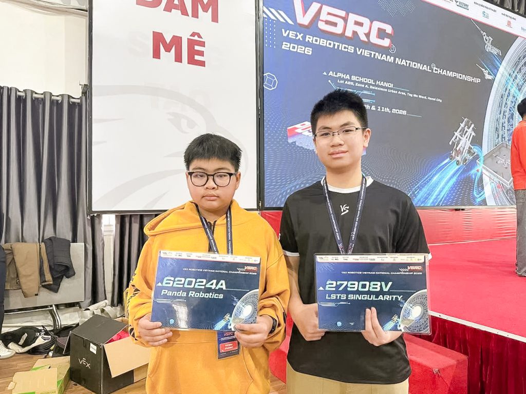 Trong Vòng Chung kết Quốc gia Việt Nam diễn ra vào ngày 10 – 11/01/2026 tại Hà Nội của giải đấu VEX Robotics 2026, em Đỗ Thanh Phong cùng đồng đội đã xuất sắc giành được giải thưởng Amaze Award, ghi dấu ấn mạnh mẽ trên sân chơi công nghệ mang tầm quốc gia.