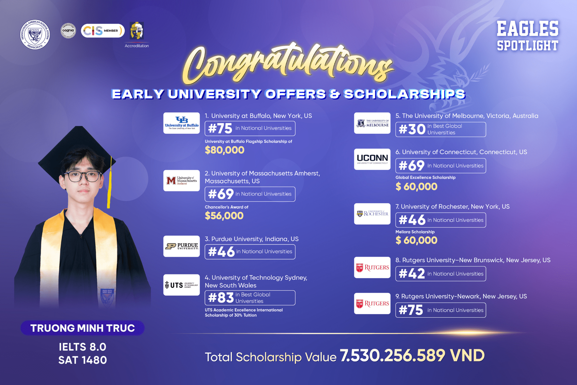 Despite the intense competition of thousands of international applications during the early admission round, PennSchool’s outstanding students have proudly secured prestigious scholarships and their first “passports” to their dream universities.