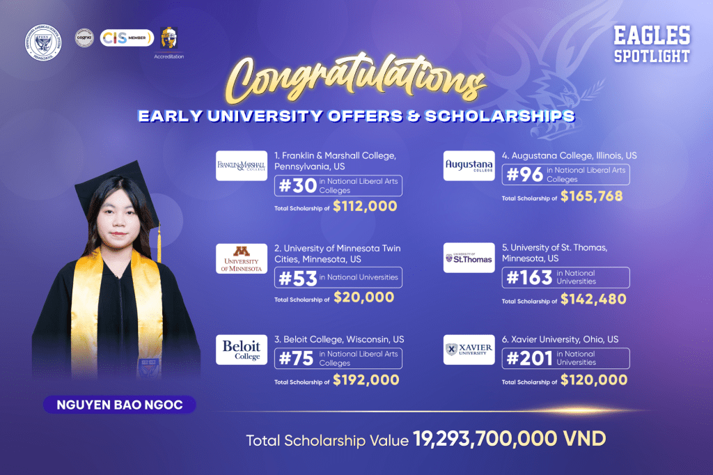 With a total scholarship value of 19,293,700,000 VND from 6 top-tier universities in the U.S., Nguyen Bao Ngoc has become an inspiring role model for our student community. Reflecting on her scholarship journey, Bao Ngoc shared: