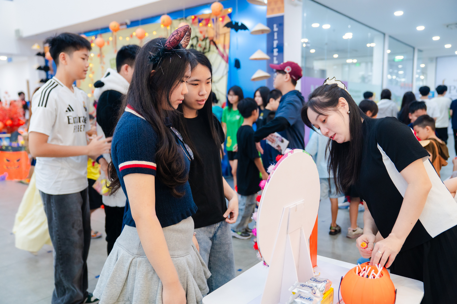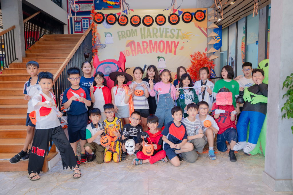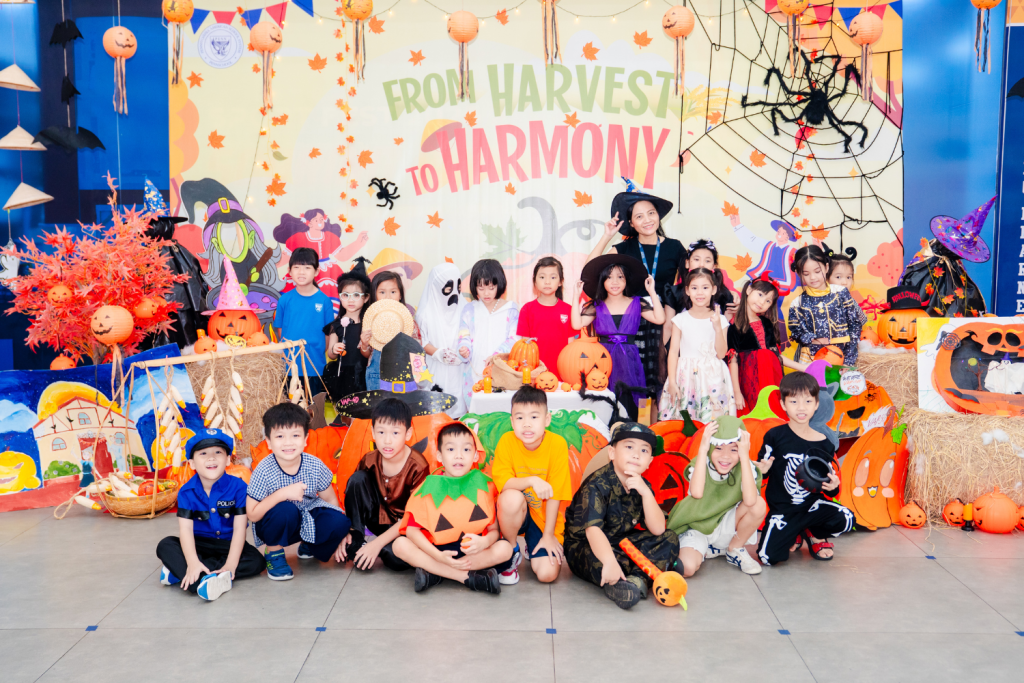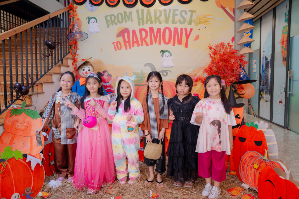 Trong không gian rực rỡ sắc cam, các em đã hóa thân thành những người nông dân Mỹ vui vẻ, tham gia các hoạt động sáng tạo và gắn kết thú vị như vẽ và trang trí “Cánh đồng bí ngô”, Wheel of Sweet Magic, Trick or Treat hay thử thách vui nhộn ăn bánh không cần tay. Những hoạt động này đã mang đến nhiều tiếng cười, đồng thời giúp các em hiểu thêm về giá trị của lòng biết ơn, sự sẻ chia, tinh thần bảo vệ môi trường và gắn kết cộng đồng.