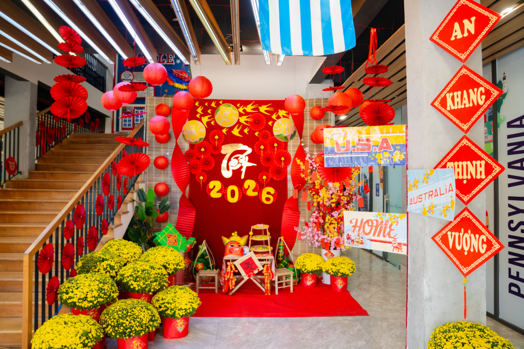 Năm nay, cộng đồng PennSchool cùng nhau bước lên chuyến tàu mang tên “The Next Stop: Prosperity”, khởi hành đón mùa Xuân mới với nhiều hy vọng và khởi đầu tốt lành. Tất cả Trạm Xuân đã sẵn sàng chào đón các #HomeOfTheEagles đến check-in, lưu giữ những khoảnh khắc đáng nhớ bên thầy cô và bạn bè. Không gian tại PennSchool đã được trang hoàng ngập tràn sắc Tết với hoa mai rực rỡ, bao lì xì, câu đối đỏ và những biểu tượng của sự thịnh vượng – hứa hẹn mang đến một năm mới may mắn, an vui và nhiều điều tích cực.