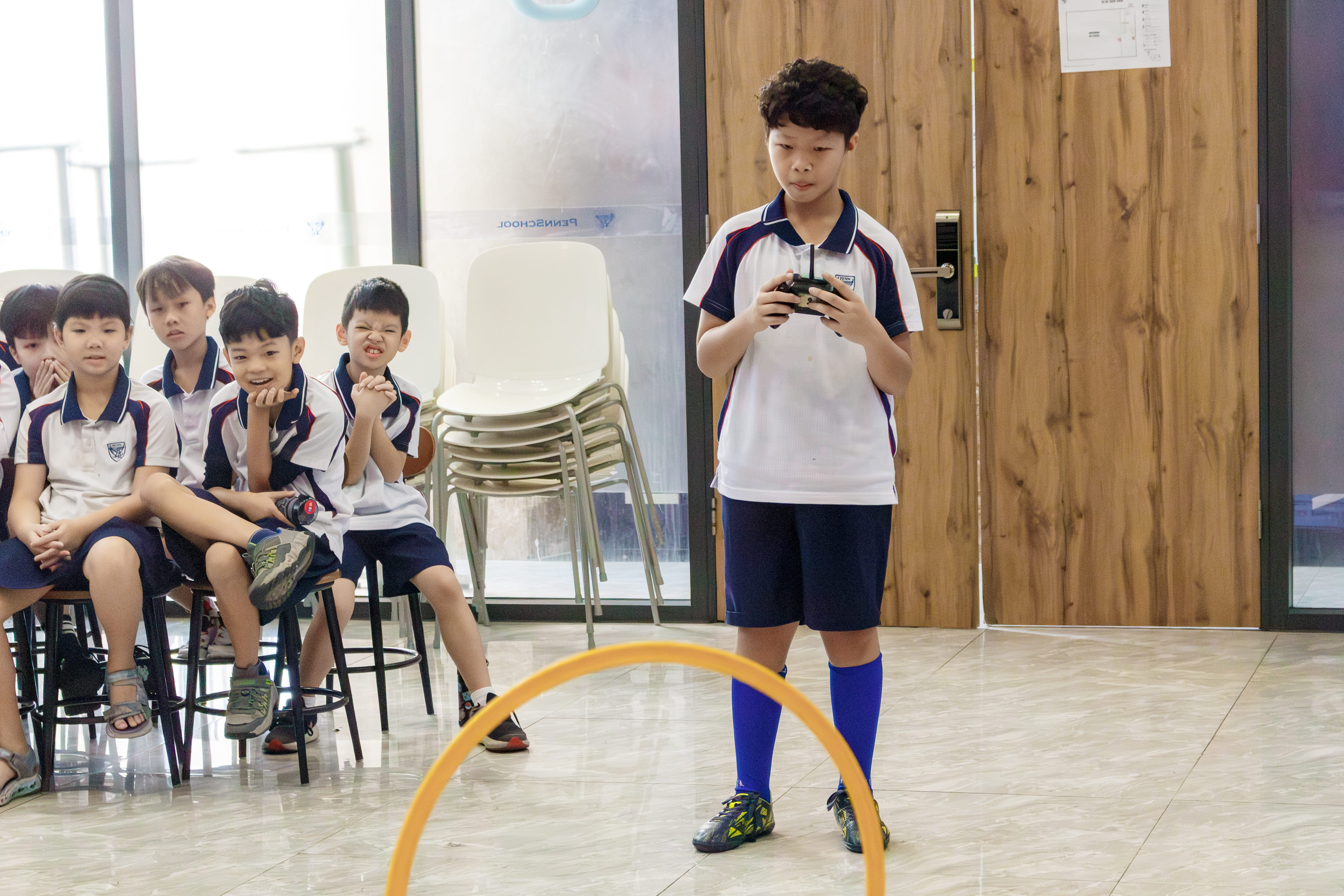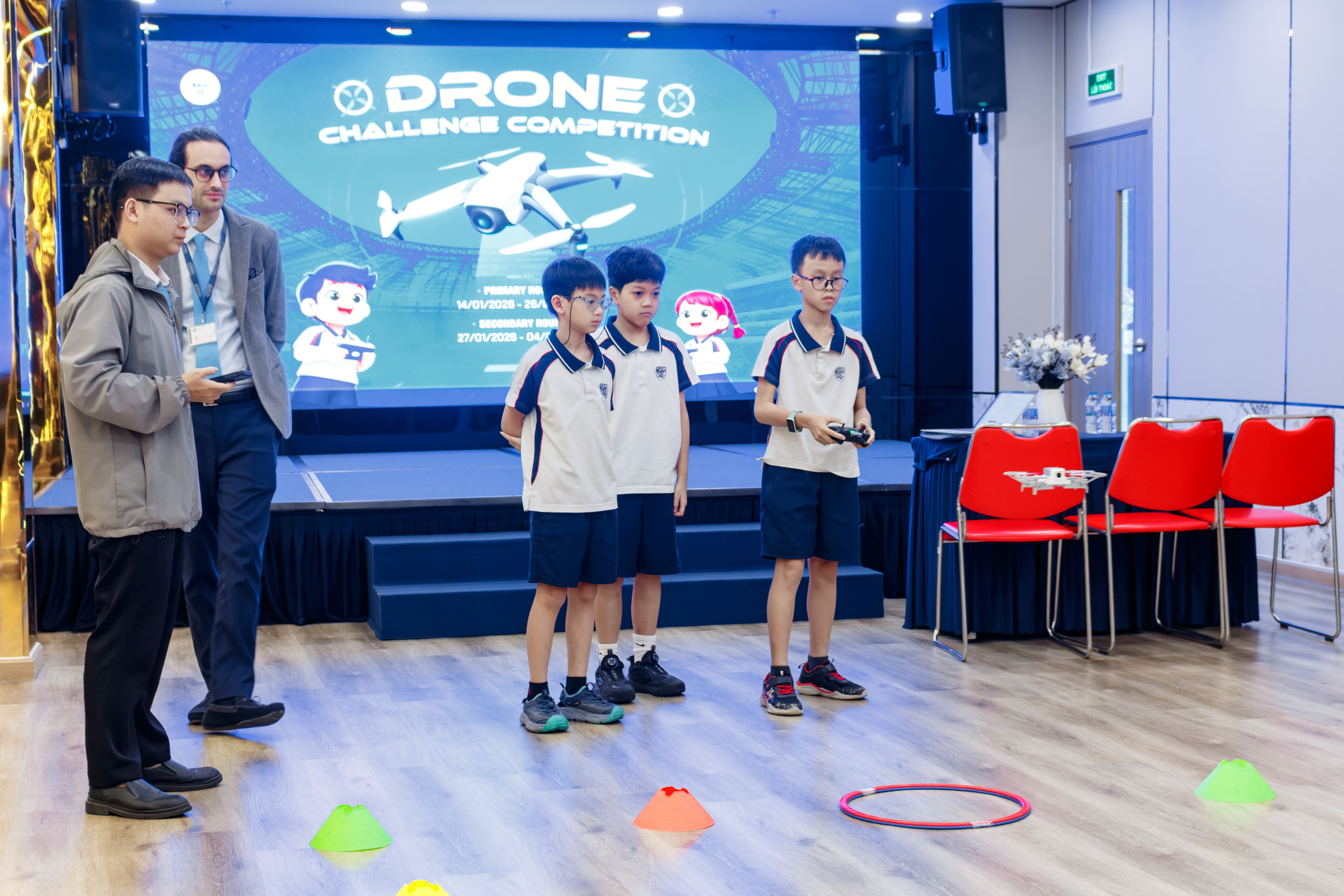 Khởi động từ ngày 14/01/2026, Drone Challenge đã mang đến cho học sinh Tiểu học một sân chơi công nghệ đầy hứng khởi, nơi việc học được chuyển hóa thành trải nghiệm trực quan và sống động. Trong từng phần thi, các em phải điều khiển Drone bay theo lộ trình được lập trình sẵn và đáp đất chính xác tại vị trí quy định. Đây là một nhiệm vụ tưởng chừng đơn giản song lại là thử thách đòi hỏi các em vận dụng sự tập trung, kiên nhẫn và tư duy chiến lược trong từng bước thực hiện.