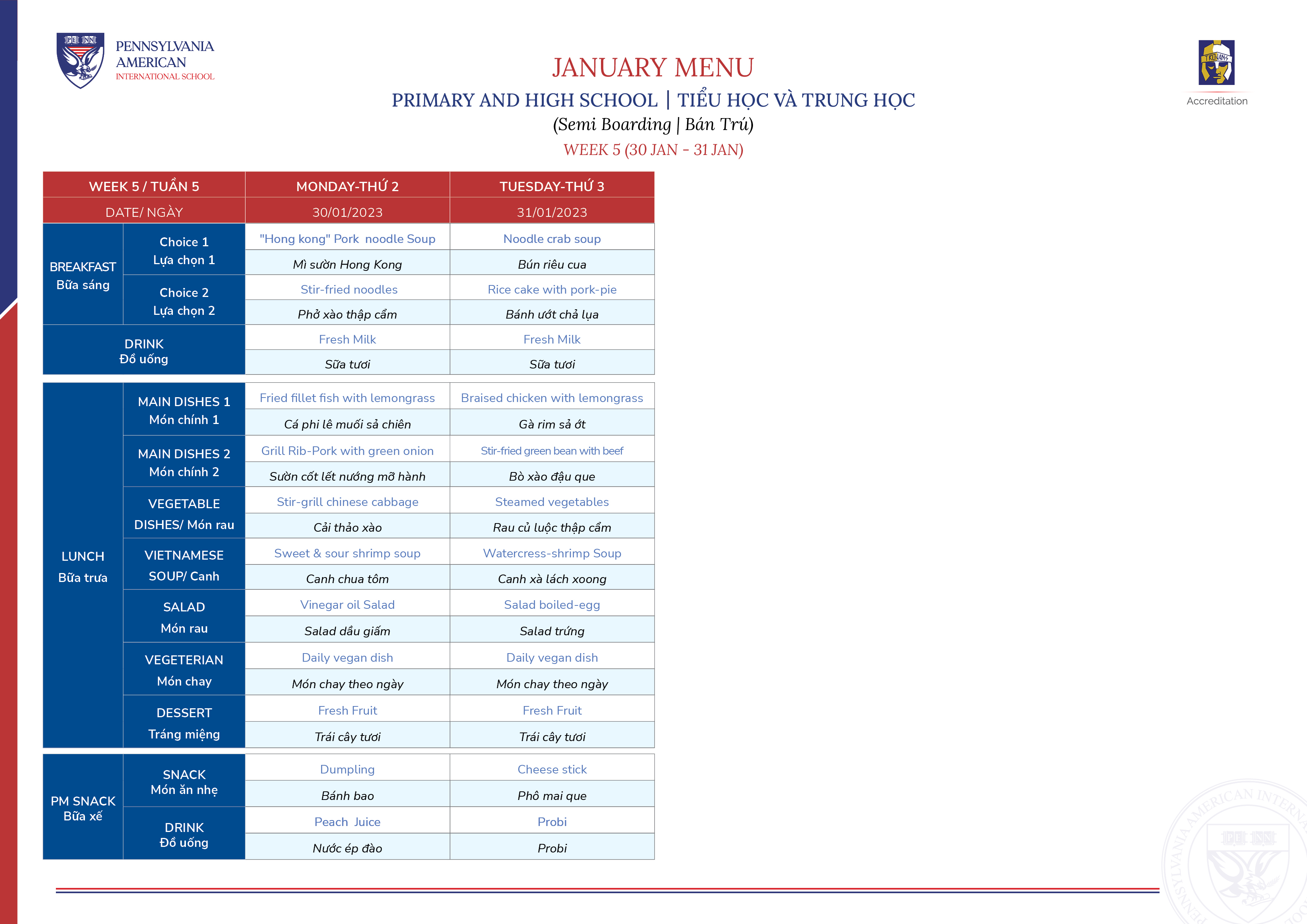 Bữa ăn tại trường cung cấp năng lượng chính để các em học sinh có thể học tập, vui chơi và phát triển thể chất toàn diện nhất. Các bữa ăn được chuẩn bị hàng ngày và phục vụ trong nhà bếp hiện đại, đầy đủ tiện nghi. Học sinh cũng có thể lựa chọn dùng phần cơm trưa mang theo từ nhà.