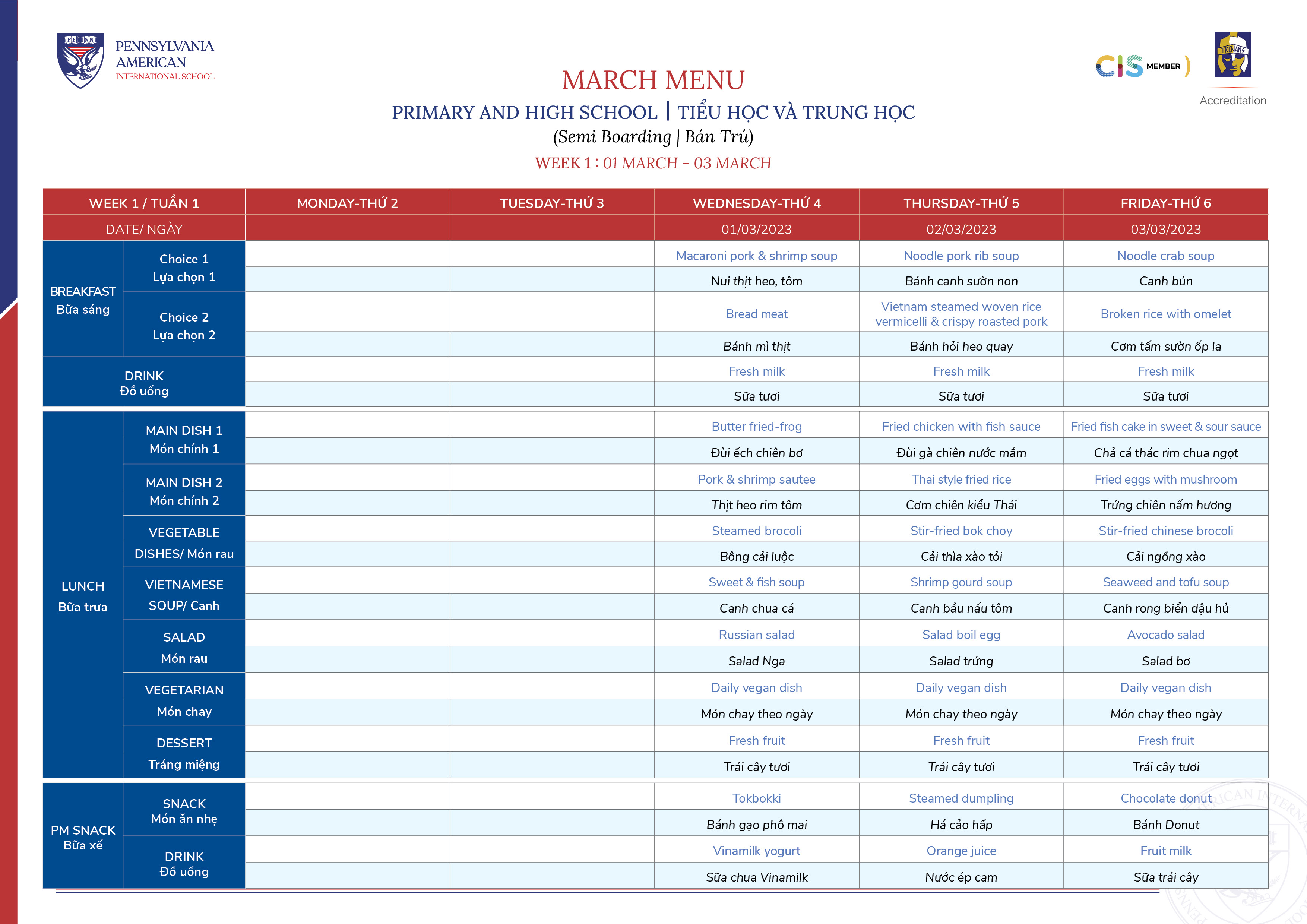 Bữa ăn tại trường cung cấp năng lượng chính để các em học sinh có thể học tập, vui chơi và phát triển thể chất toàn diện nhất. Các bữa ăn được chuẩn bị hàng ngày và phục vụ trong nhà bếp hiện đại, đầy đủ tiện nghi. Học sinh cũng có thể lựa chọn dùng phần cơm trưa mang theo từ nhà.