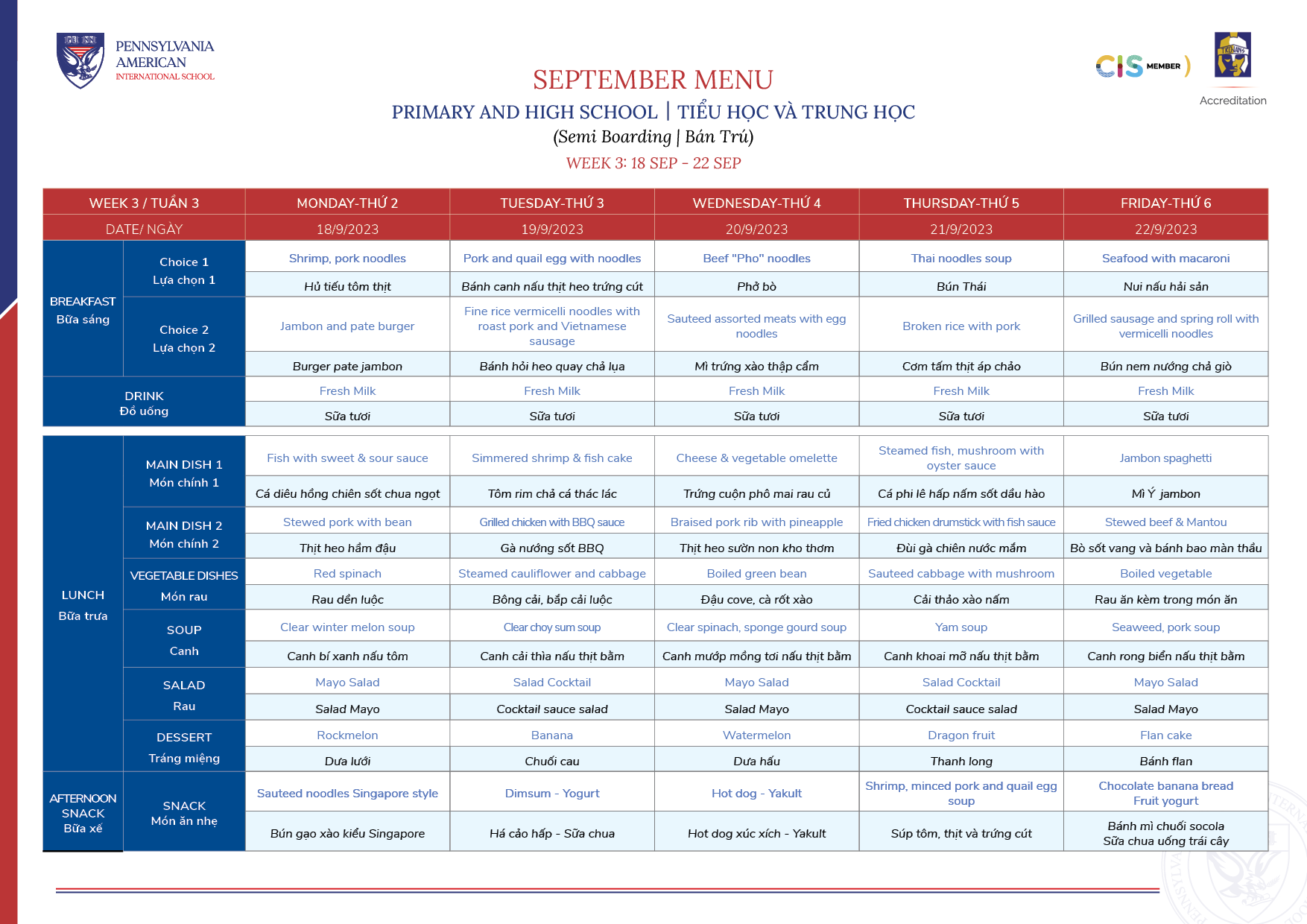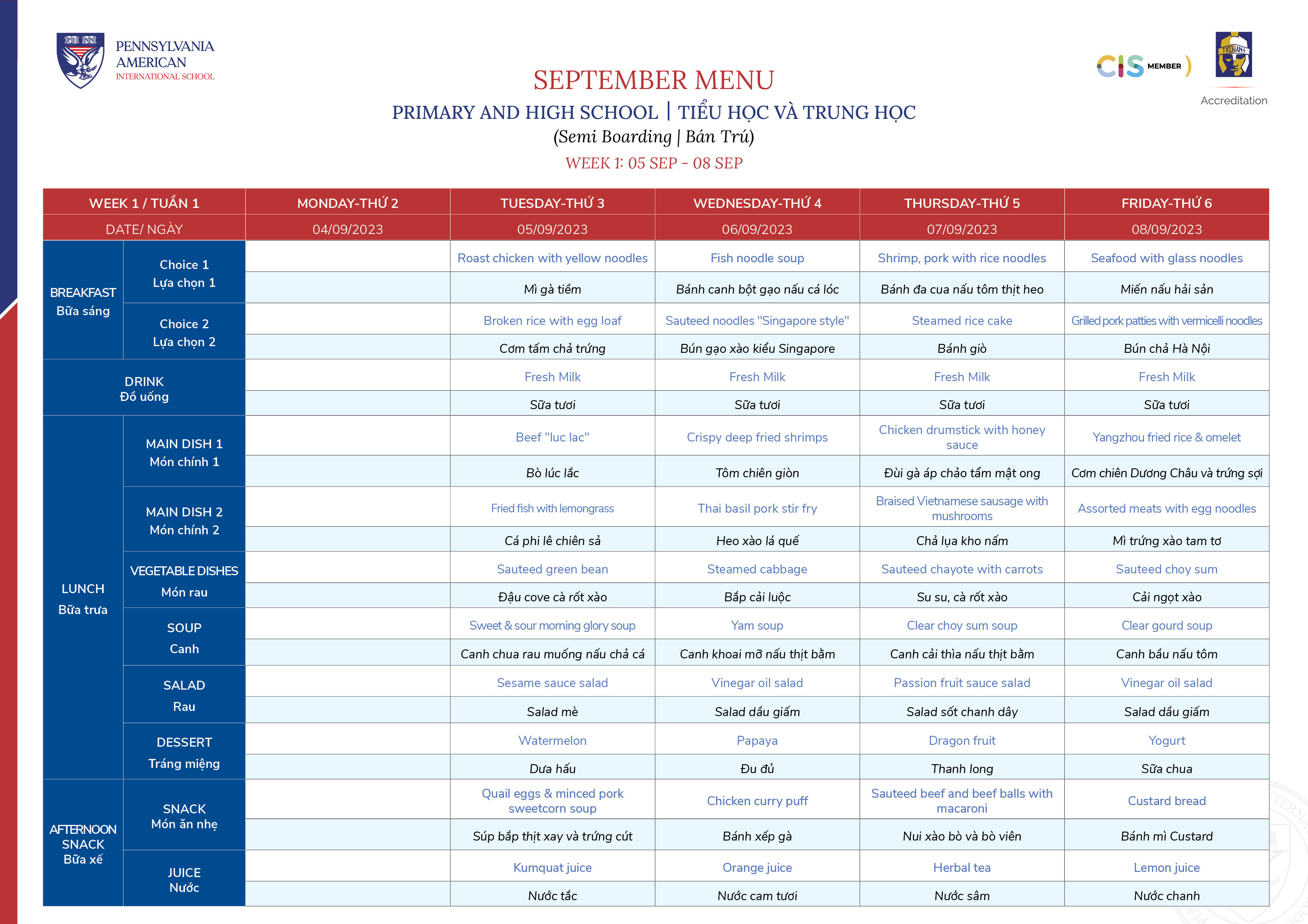 Thực đơn Tháng 09/2023