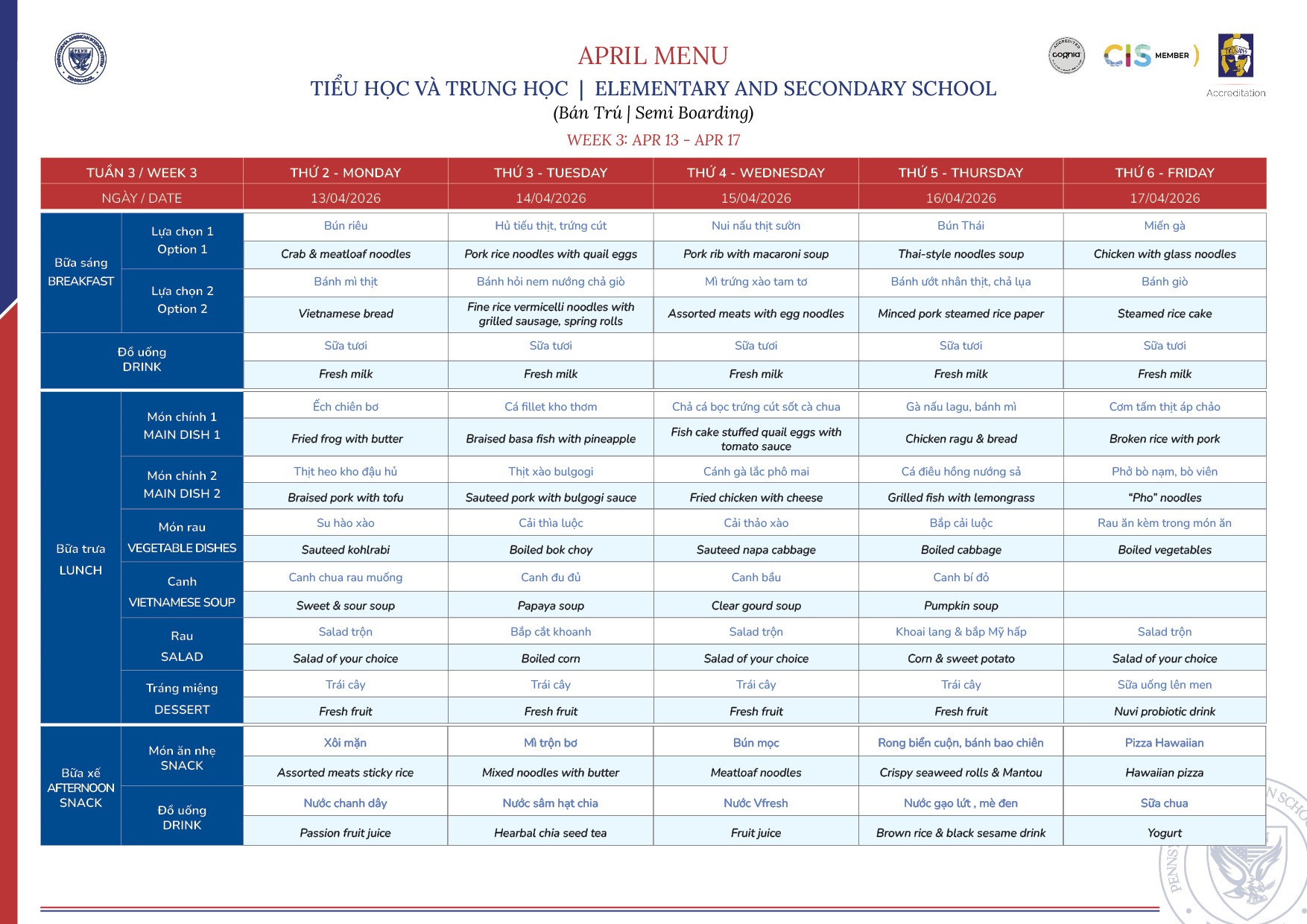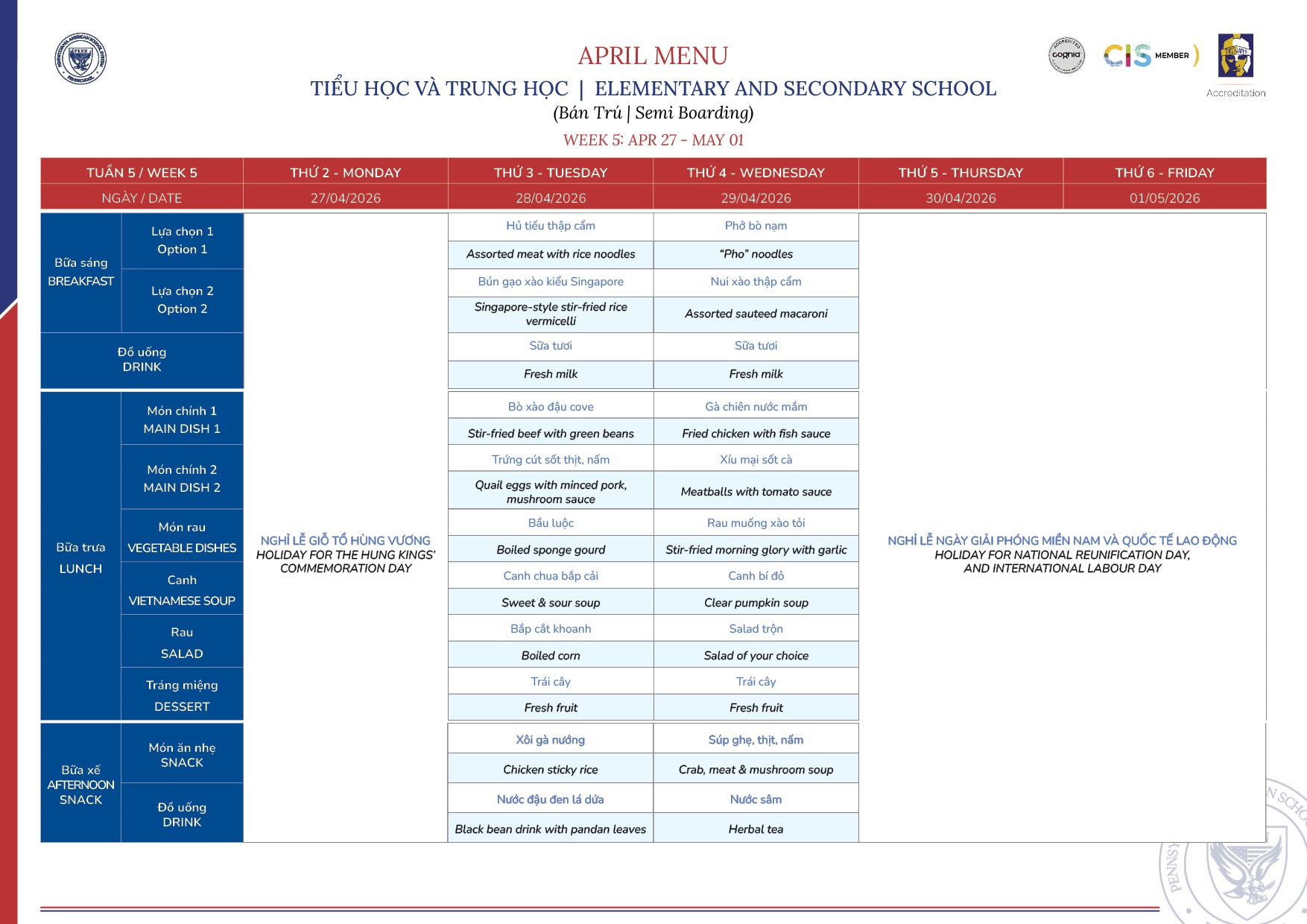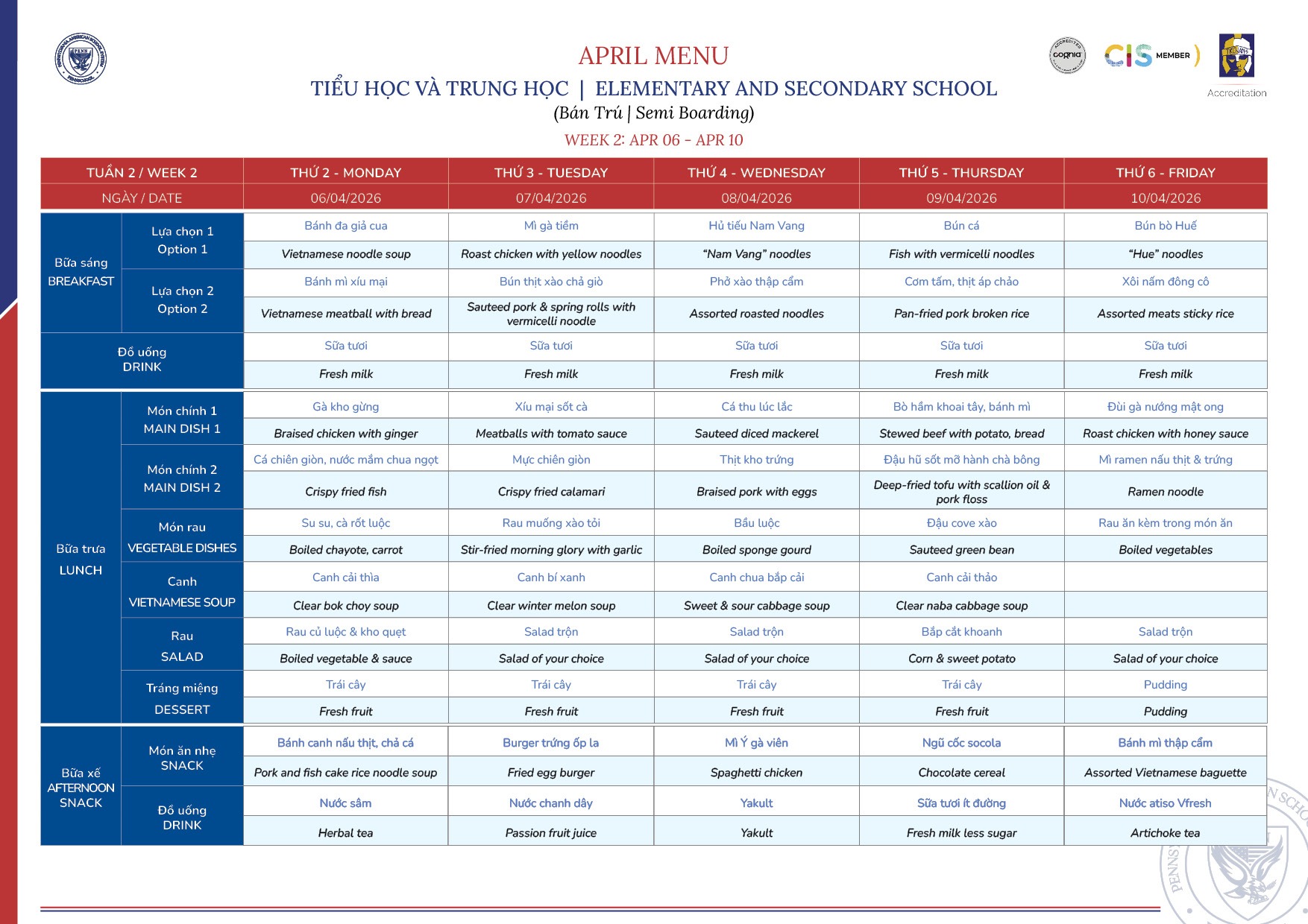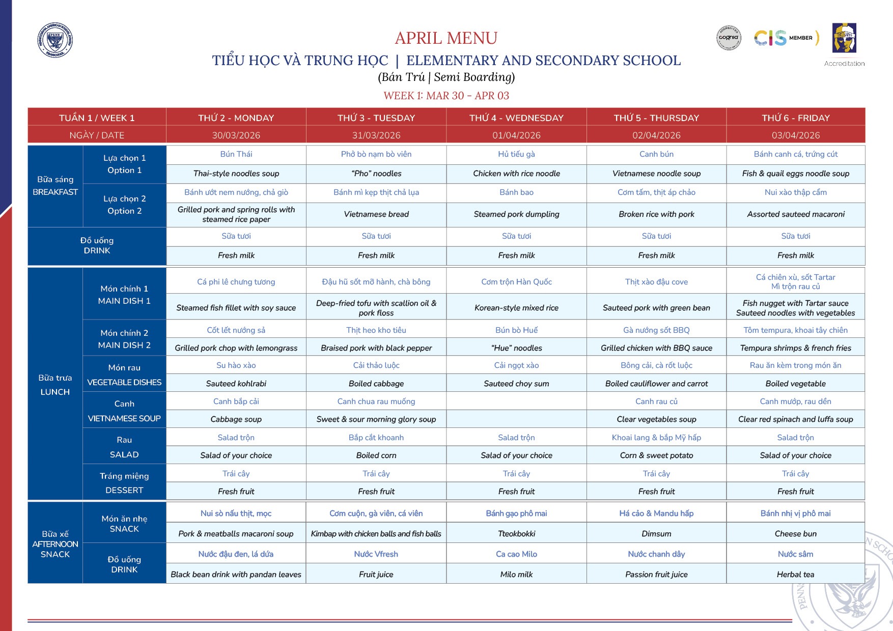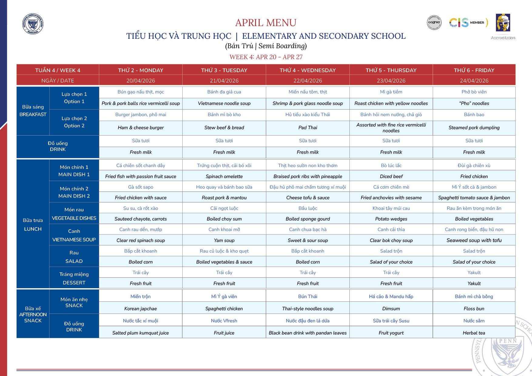 Thực đơn tháng 4/2026