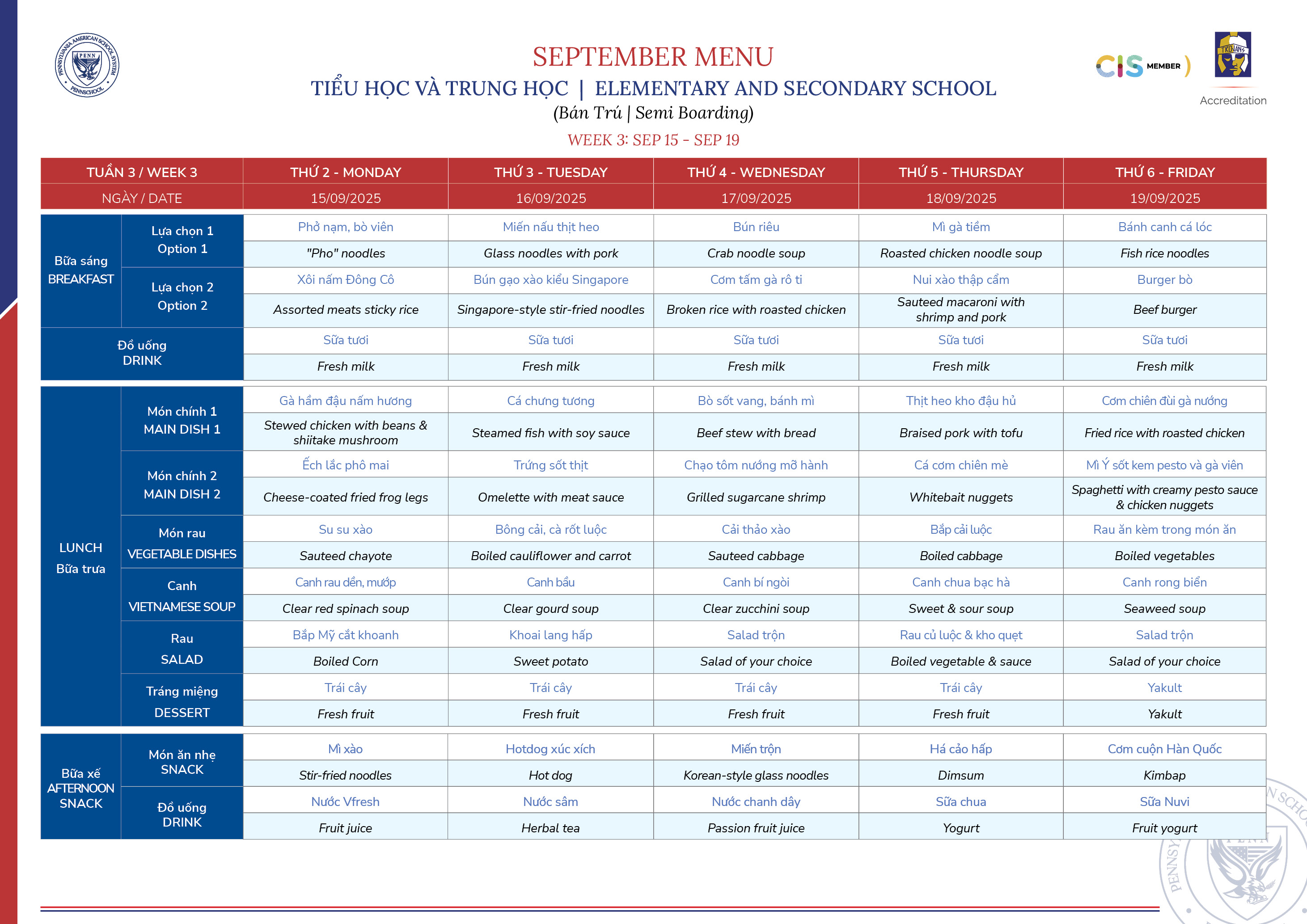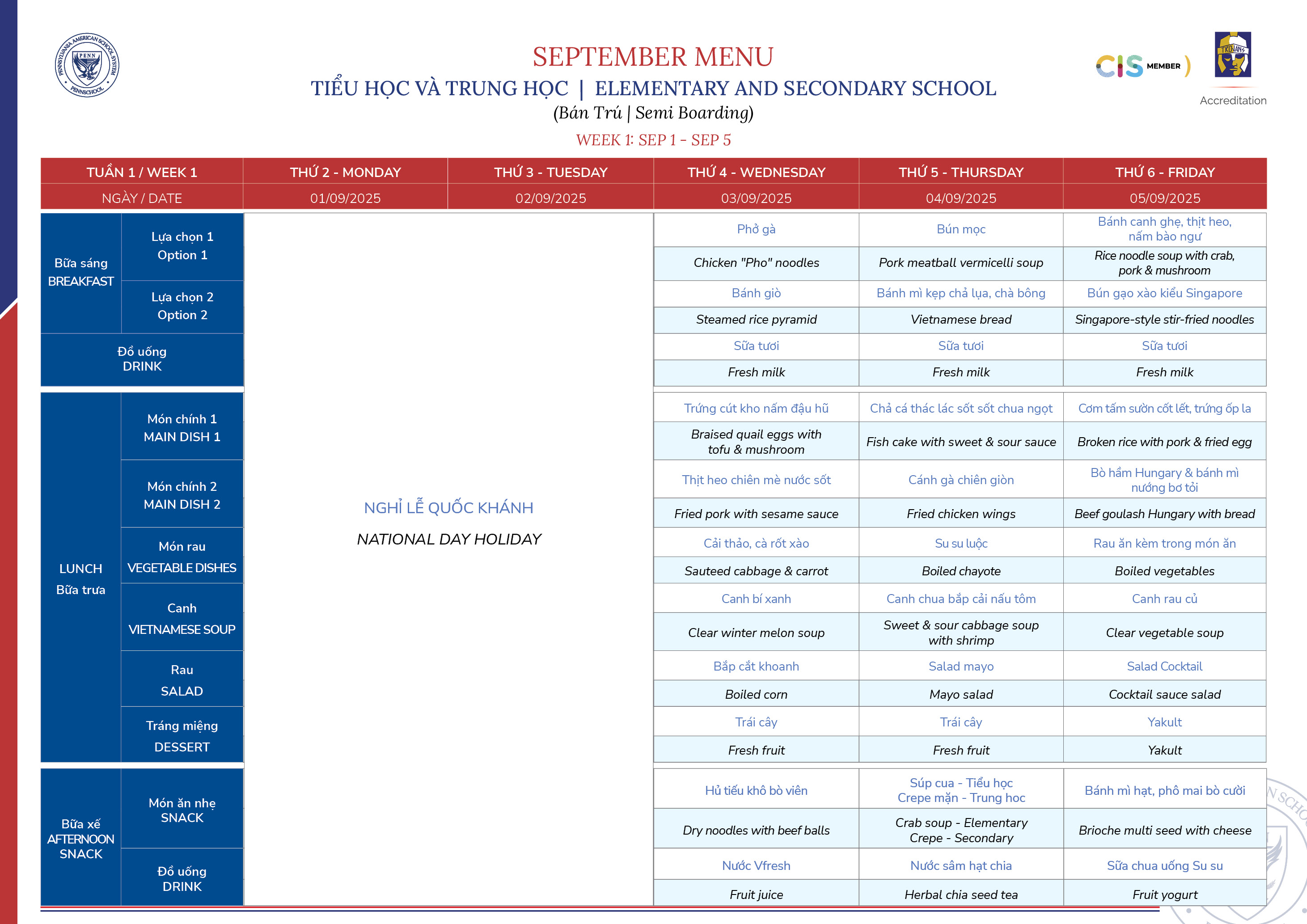 Thực đơn tháng 9/2025